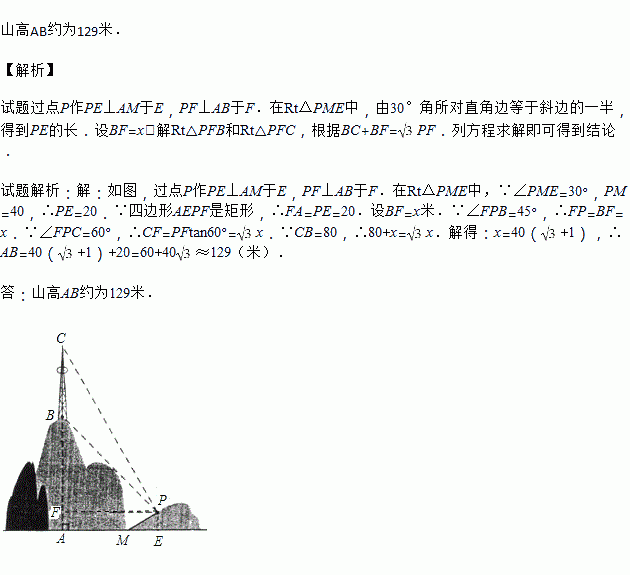 如图,山顶建有一座铁塔,塔高BC=80米,测量人员在一个小山坡的P处测得塔的底部B点的仰角为45°,塔顶C点的仰角为60°.已测得小山坡的坡角为30°,坡长MP=40米.求山的高度AB(精确到1米).(参考数据: