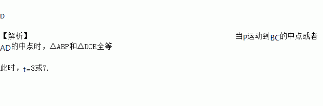 D 【解析】当P运动到BC的中点或者AD的中点时,△ABP和△DCE全等 此时,t=3或7.