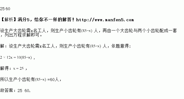 某车间有工人85人,平均每人每天可加工大齿轮12个或小齿轮10个,又知一个大齿轮与两个小齿轮配成一套,则应安排_______名工人生产大齿轮、________名工人生产小齿轮能使每天生产的产品刚好成套.