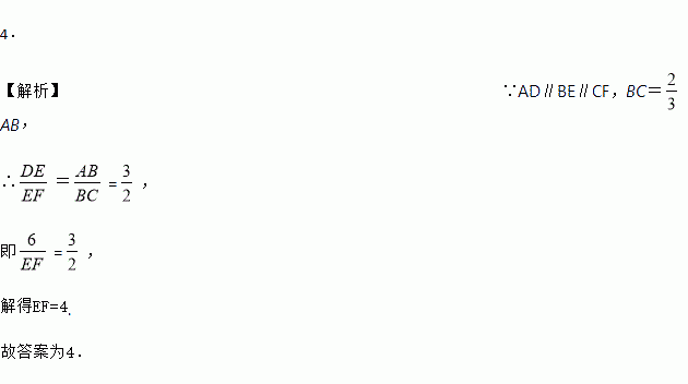 如图,直线AD∥BE∥CF,BC=AB,DE=6,那么EF的值是________ .