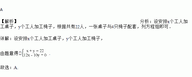 某木工厂有22人,一个工人每天可加工3张桌子或10只椅子,1张桌子与4只椅子配套,现要求工人每天做的桌子和椅子完整配套而没有剩余,若设安排x个工人加工桌子,y个工人加工椅子,则列出正确的二元一次方程组为( )