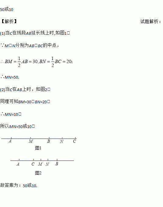 50或10 【解析】试题解析: (1)当C在线段AB延长线上时,如图1, ∵M、N分别为AB、BC的中点, ∴MN=50. (2)当C在AB上时,如图2, 同理可知BM=30,BN=20, ∴MN=10, 所以MN=50或10, 故答案为:50或10.