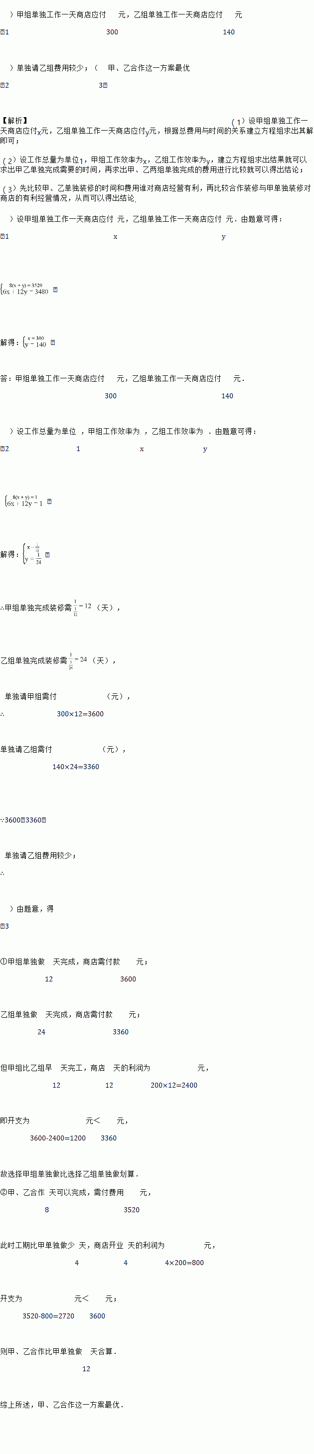 一家商店要进行装修,若请甲、乙两个装修组同时施工,8天可以完成,需付两组费用共3520元,若先请甲组单独做6天,再请乙组单独做12天可以完成,需付两组费用共3480元,问: