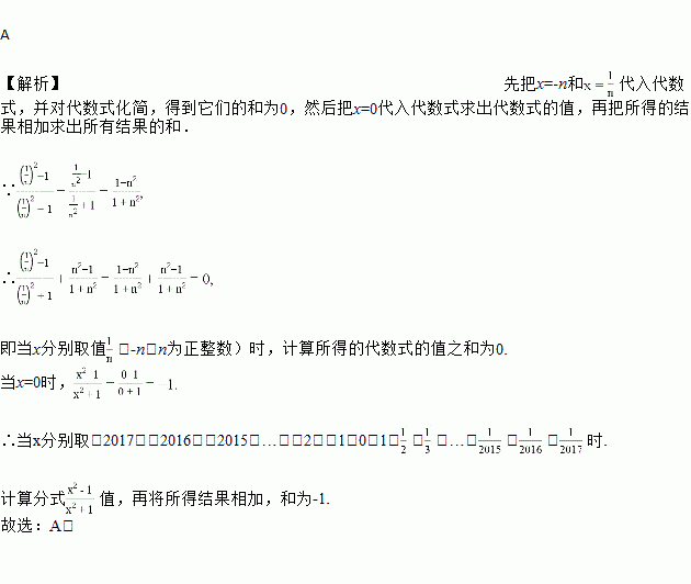 当x分别取-2017、-2016、-2015、…、-2、-1、0、1、、、…、、、时,计算分式的值,再将所得结果相加,其和等于( )