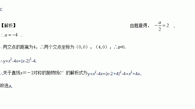已知抛物线C:y=x2+ax+b的对称轴是直线x=2,且与x轴有两个交点,两交点的距离为4,则抛物线C关于直线x=-2对称的抛物线C′的解析式为( )