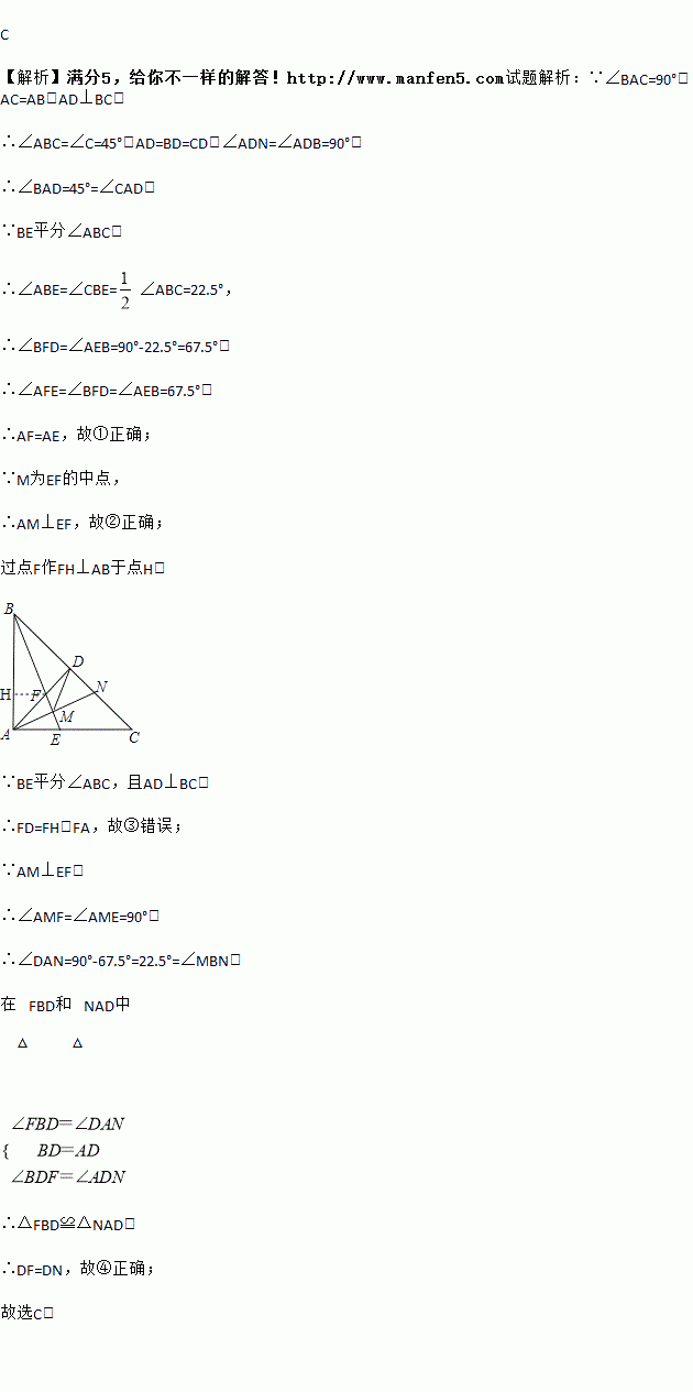 ,AD⊥BC于D,∠ABC的平分线分别交AC、AD于E、F两点,M为EF的中点,延长AM交BC于点N,连接DM.下列结论:①AE=AF;②AM⊥EF;③AF=DF;④DF=DN,其中正确的结论有( )