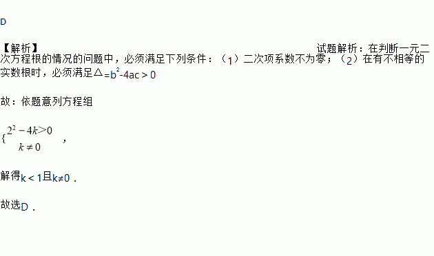 关于 x 的一元二次方程 kx 2 +2 x +1=0有两个不相等的实数根,则 k 的取值范围是( ).