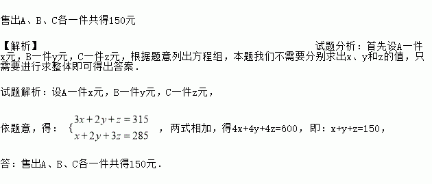 现有A、B、C三种型号的产品出售,若售A3件,B2件,C1件,共得315元;若售A1件,B2件,C3件,共得285元.问售出A、B、C各一件共得多少元?