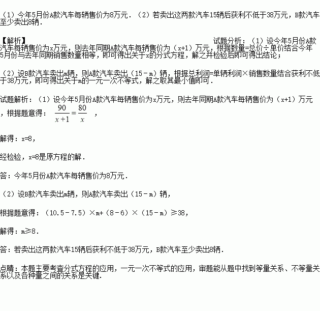 (2)为了增加收入,汽车销售公司决定再经销同品牌的B款汽车,已知B款汽车每辆进价为7.5万元,每辆售价为10.5万元,A款汽车每辆进价为6万元,若卖出这两款汽车15辆后获利不低于38万元,问B款汽车至少卖出多少辆?