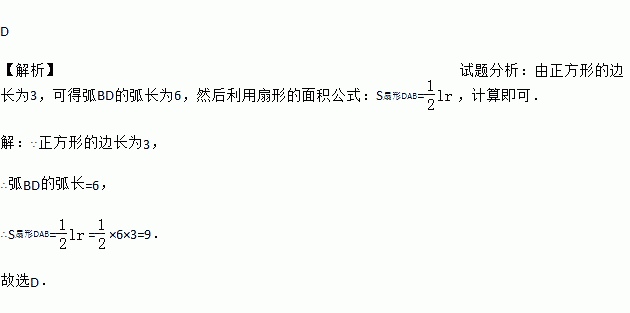 如图,某数学兴趣小组将边长为3的正方形铁丝框ABCD变形为以A为圆心,AB为半径的扇形(忽略铁丝的粗细),则所得的扇形DAB的面积为( )