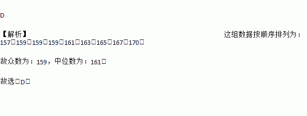 D 【解析】这组数据按顺序排列为:157,159,159,159,161,163,165,167,170, 故众数为:159,中位数为:161. 故选:D.
