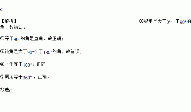 ①小于90°的角是锐角;②等于90°的角是直角;③大于90°的角是钝角;④平角等于180°;⑤周角等于360°.