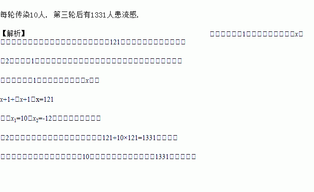 春季是流感的高发期,有一人患了流感,经过两轮传染后共有121人患了流感,每轮传染中平均一个人传染了几个人?如果按照这样的传染速度,三轮传染后有多少人患流感?