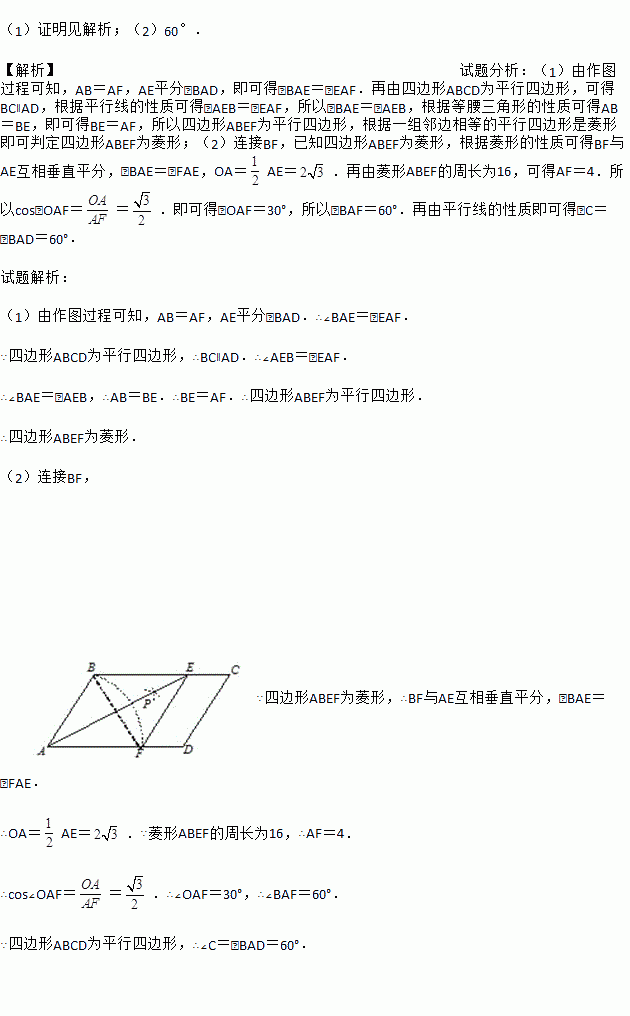 BF的相同长为半径画弧,两弧交于点P;连接AP并延长交BC于点E,连接EF,则所得四边形ABEF是菱形.