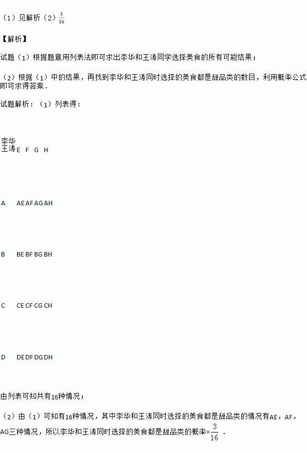 甘肃省省府兰州,又名金城,在金城,黄河母亲河通过自身文化的演绎,衍生和流传了独特的“金城八宝”美食,“金城八宝”美食中甜品类有:味甜汤糊“灰豆子”、醇香软糯“甜胚子”、生津润肺“热冬果”、香甜什锦“八宝百合”;其他类有:青白红绿“牛肉面”、酸辣清凉“酿皮子”、清爽溜滑“浆水面”、香醇肥美“手抓羊肉”,李华和王涛同时去品尝美食,李华准备在“甜胚子、牛肉面、酿皮子、手抓羊肉”这四种美食中选择一种,王涛准备在“八宝百合、灰豆子、热冬果、浆水面”这四种美食中选择一种.(甜胚子、牛肉面、酿皮子、手抓羊肉分别记为A,B,C,D,八宝百合、灰豆子、热冬果、浆水面分别记为E,F,G,H)