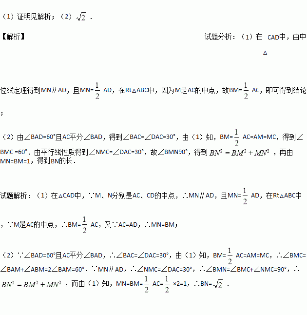 (2)∠BAD=60°,AC平分∠BAD,AC=2,求BN的长.