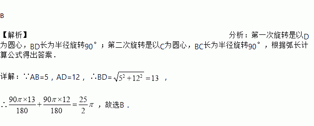 矩形ABCD中,AB=5,AD=12,将矩形ABCD按如图所示的方式在直线l上进行两次旋转,则点B在两次旋转过程中经过的路径的长是( )