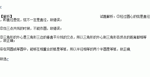 下列四个命题:①弦是直径;②经过三个点一定可以作圆;③三角形的外心到三角形各顶点的距离都相等;④半径相等的两个半圆是等弧。其中正确的有( )