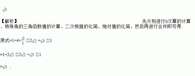 计算:(3-π)0+4sin45°-+|1-|.
