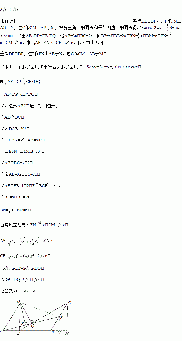 平行四边形ABCD中,AB:BC=3:2,∠DAB=60°,点E在AB上且AE:EB=1:2,点F是BC中点,过D作DP⊥AF于点P,DQ⊥CE于点Q,则DP:DQ=_______.