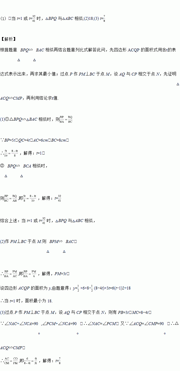 (1)若△BPQ 与△ABC 相似,求 t 的值;