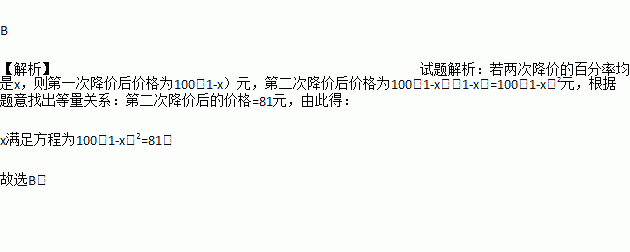A. 100(1+x)2=81 B. 100(1-x)2=81