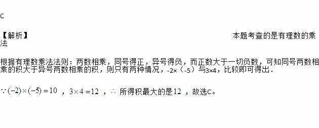 C 【解析】本题考查的是有理数的乘法 根据有理数乘法法则:两数相乘,同号得正,异号得负,而正数大于一切负数,可知同号两数相乘的积大于异号两数相乘的积,则只有两种情况,-2×(-5)与3×4,比较即可得出. ,,所得积最大的是,故选C。