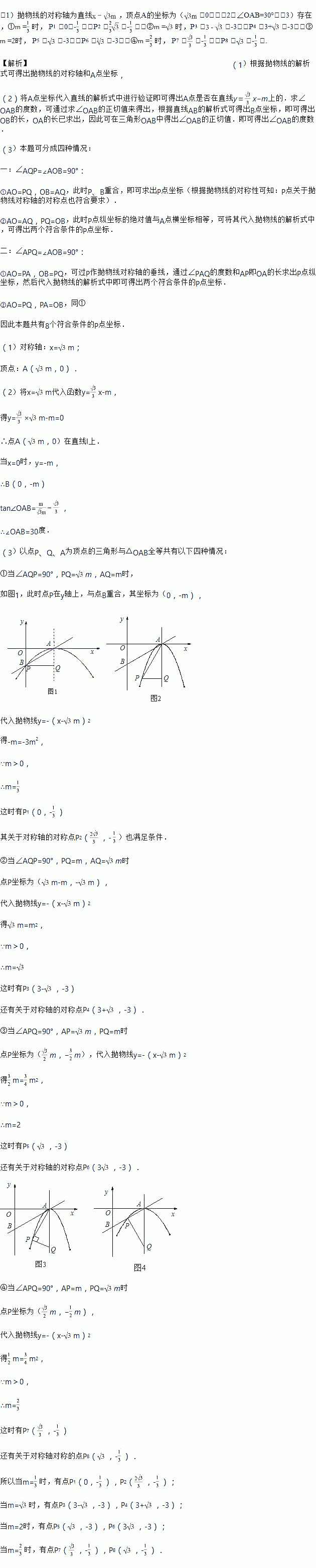 (3)动点Q在抛物线对称轴上,问:抛物线上是否存在点P,使以点P、Q、A为顶点的三角形与△OAB全等?若存在,求出的值,并写出所有符合上述条件的点P的坐标;若不存在,请说明理由.![]()