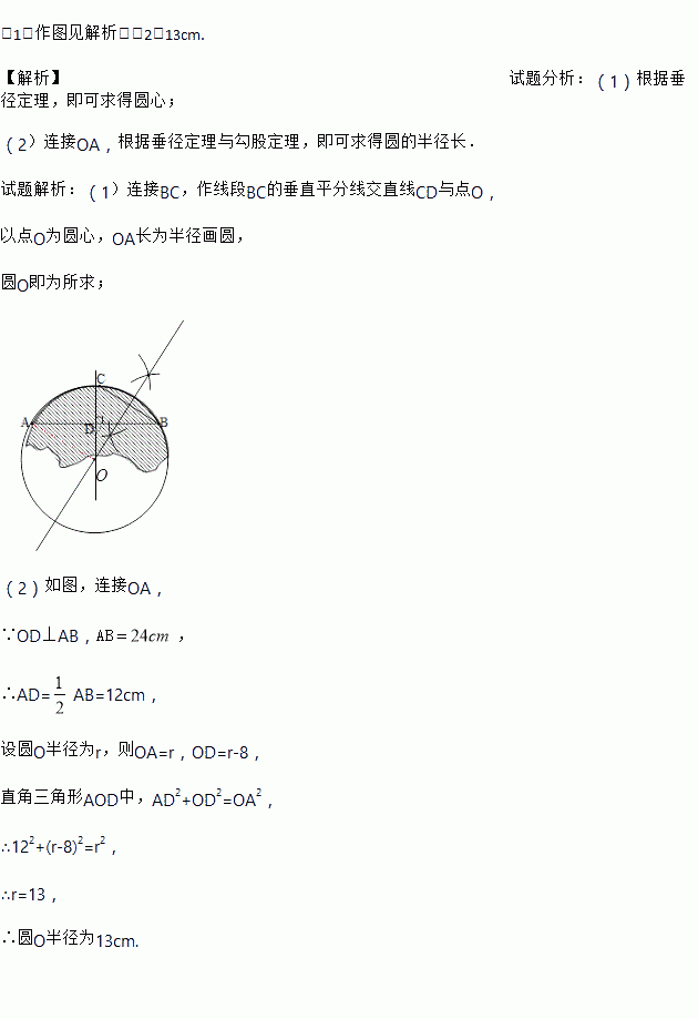 (1)求作此残片所在的圆(不写作法,保留作图痕迹);