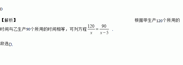 甲、乙两人生产某种机器零件,甲每小时比乙多生产5个,甲生产120个所用的时间与乙生产90个所用的时间相等。设甲每小时生产个两件,根据题意,列出的方程是( )