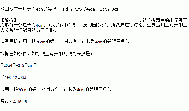 能围成有一边长为4cm的等腰三角形,各边为4cm,8cm,8cm. 【解析】试题分析题目给出等腰三角形有一条边长为4cm,而没有明确腰、底分别是多少,所以要进行讨论,还要应用三角形的三边关系验证能否组成三角形. 试题解析:用一根20cm的绳子能围成有一边长为4cm的等腰三角形. 根据已知条件,知等腰三角形的两腰的长度是: (20﹣4)÷2=8(cm) ∵4+8=12>...