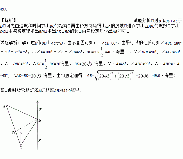 一货轮在C处测得灯塔A在货轮的北偏西30的方向上,随后货轮以80海里/时的速度按北偏东30°的方向航行,半小时后到达B处,此时又测得灯塔A在货轮的北偏西75°的方向上,求此时货轮距灯塔A的距离AB(结果保留3个有效数字,