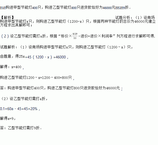 (2)为确保乙型节能灯顺利畅销,在(1)的条件下,商家决定对乙型节能灯进行打折出售,且全部售完后,乙型节能灯的利润率为20%,请问乙型节能灯需打几折?