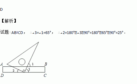 如图,将三角形的直角顶点放在直尺的一边上,若∠1=65°,则∠2的度数为( )