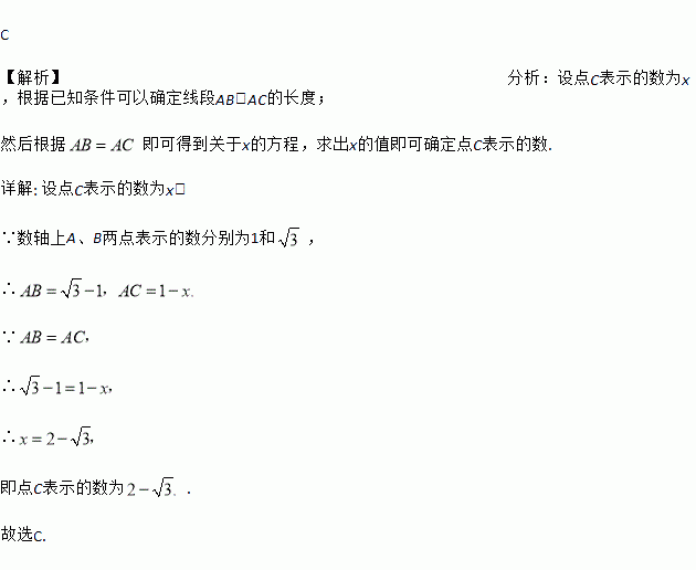 如图,数轴上A、B两点表示的数分别为1和,且AB=AC,那么数轴上C点表示的数为( )
