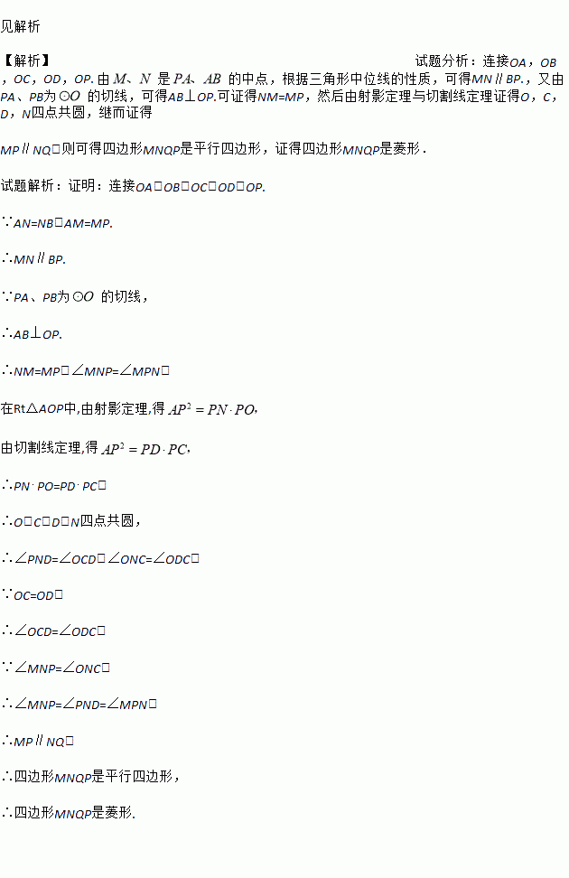 如图所示,PA、PB为⊙O的切线,M、N是PA、AB的中点,连接MN交⊙O点C,连接PC交⊙O于D,连接ND交PB于Q,求证:MNQP为菱形.