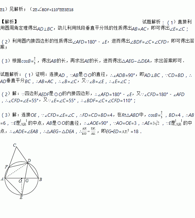 如图,AB是⊙O的直径,D、E为⊙O上位于AB异侧的两点,连接BD并延长至点C,使得CD=BD,连接AC交⊙O于点F,连接AE、DE、DF.