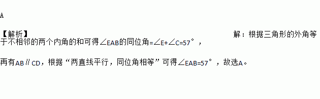 A 【解析】【解析】 根据三角形的外角等于不相邻的两个内角的和可得∠EAB的同位角=∠E+∠C=57°, 再有AB∥CD,根据“两直线平行,同位角相等”可得∠EAB=57°,故选A。