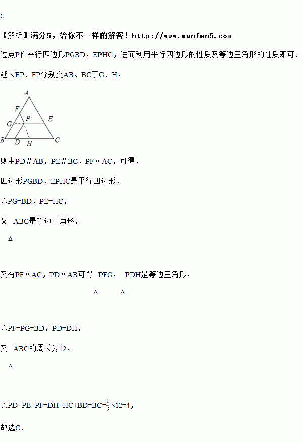 如图,△ABC是等边三角形,点P是三角形内的任意一点,PD∥AB,PE∥BC,PF∥AC,若△ABC的周长为12,则PD+PE+PF=( )
