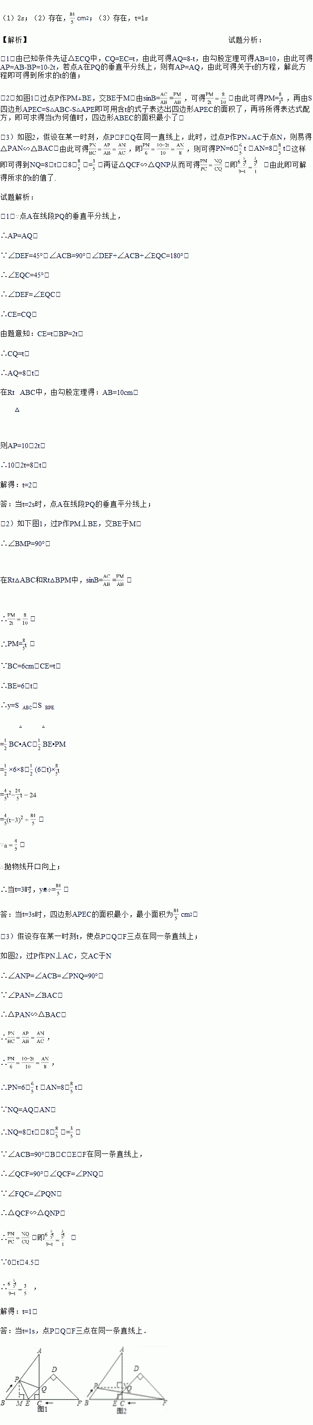 已知:把Rt△ABC和Rt△DEF按如图(1)摆放(点C与点E重合),点B、C(E)、F在同一条直线上,∠ACB=∠EDF=90°,∠DEF=45°,AC=8cm,BC=6cm,EF=9cm.如图(2),△DEF从图(1)的位置出发,以1cm/s的速度沿CB向△ABC匀速移动,在△DEF移动的同时,点P从△ABC的顶点B出发,以2cm/s的速度沿BA匀速移动,当△DEF的顶点D移动到AC边上时,△DEF停止移动,点P也随之停止移动,DE与AC相交于点Q,连接PQ,设移动时间为t(s)(0<t<4.5).