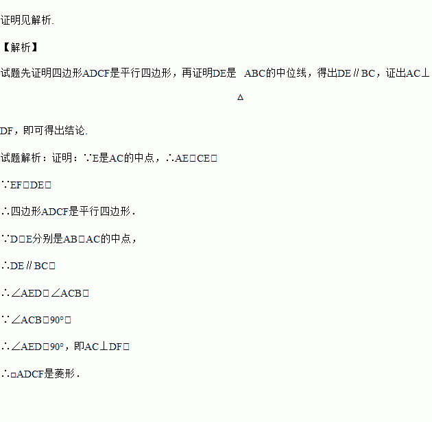 如图,在Rt△ABC中,∠ACB=90°,D、E分别是AB、AC的中点,连接DE并延长至点F,使EF=DE,连接AF,DC.求证:四边形ADCF是菱形.