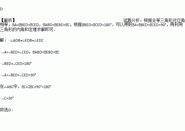 如图,在△ABC中,D、E分别是AC、BC上的点,若△ADB≌△EDB≌△EDC,则∠C的度数为( )