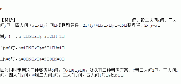 一宾馆有二人间、三人间、四人间三种客房供游客租住,某旅行团15人准备同时租用这三种客房共5间,如果每个房间都住满,租房方案有( )