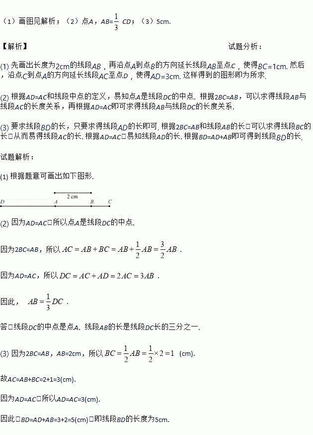 (1)画图见解析;(2)点A,AB=CD;(3)5cm. 【解析】试题分析: (1) 先画出长度为2cm的线段AB,再沿点A到点B的方向延长线段AB至点C,使得BC=1cm. 然后,沿点C到点A的方向延长线段AC至点D,使得AD=3cm. 这样得到的图形即为所求. (2) 根据AD=AC和线段中点的定义,易知点A是线段DC的中点. 根据2BC=AB,可以求得线段AB与线段AC的长...