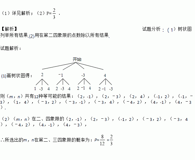 有4张正面分别标有数字﹣1,2,﹣3,4的不透明卡片,它们除数字外其余全部相同,现将它们背面朝上,洗匀后从4张卡片中随机摸出一张不放回,将该卡片上的数字记为m,在随机抽取1张,将卡片的数字即为n.