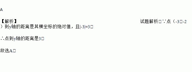 A 【解析】试题解析:∵点(-3,-2)到y轴的距离是其横坐标的绝对值,且|-3|=3, ∴点到y轴的距离是3. 故选A.