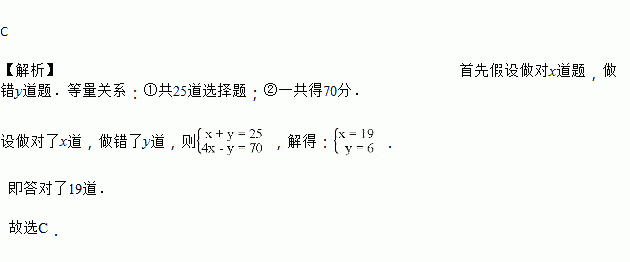 一张试卷有25道选择题,做对一题得4分,做错一题扣一分,小明做了全部试题,得70分,则他做对了