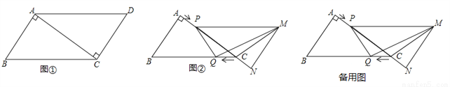 已知:如图①,在平行四边形ABCD中,AB=3cm,BC=5cm,AC⊥AB.△ACD沿AC的方向匀速平移得到△PNM,速度为1cm/s;同时,点Q从点C出发,沿着CB方向匀速移动,速度为1cm/s;当△PNM停止平移时,点Q也停止移动,如图②.设移动时间为t(s)(0<t<4).连接PQ、MQ、MC.解答下列问题: