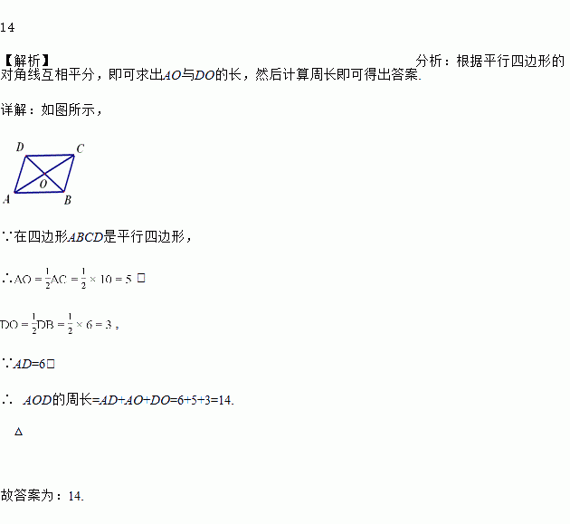 已知在□ABCD中,对角线AC与BD相交于点O,如果AD=6,AC=10,BD=6,那么△AOD的周长是______________.