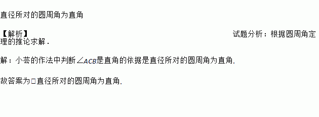 直径所对的圆周角为直角 【解析】试题分析:根据圆周角定理的推论求解. 【解析】 小芸的作法中判断∠ACB是直角的依据是直径所对的圆周角为直角. 故答案为:直径所对的圆周角为直角.